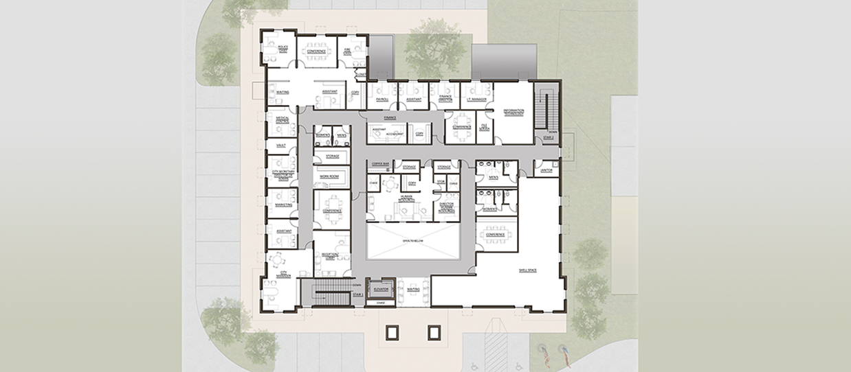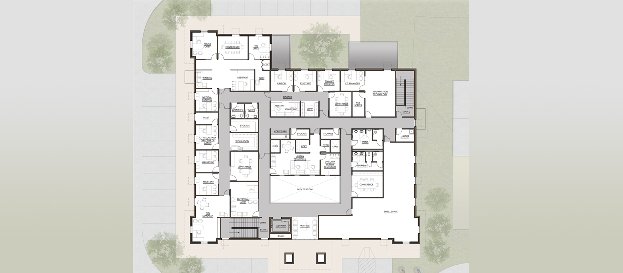 This new two-story city hall nestles in adjacent to an existing city facility on a one-acre site. The council chamber is the core of the building with engineering and planning offices on one side. Future shell space and the public portion of the building is located on the other side. The second floor hosts management and accounting office space with a portion of the floor open to the lobby below.